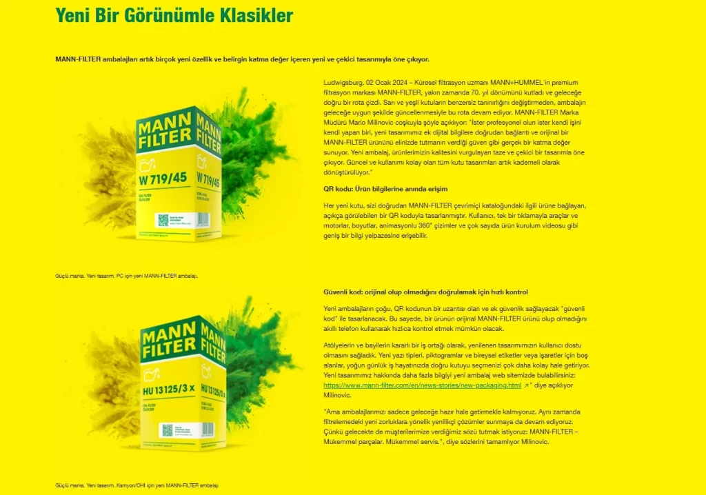 MANN filtrelerinde kutu tasarımı değiştiği için ambalajlarda farklılıklar görülebilir. Bilgilendirme amacıyla MANN’ın resmi web sitesindeki duyurular görsele eklenmiştir. Dilerseniz siz de MANN’ın resmi sitesini ziyaret ederek bu durumu doğrulabilirsiniz.