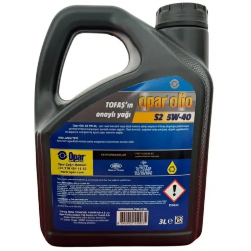 Opar Olio S2 5W-40, yeni nesil benzinli veya dizel motora sahip araçların ihtiyaç duyduğu performans gereksinimlerini karşılayan sentetik motor yağıdır. Özel formülü, soğukta kolay çalışma, düşük yağ tüketimi ve asgariye indirgenmiş egzoz gazı salınımı sağlar.